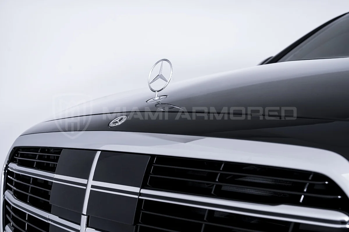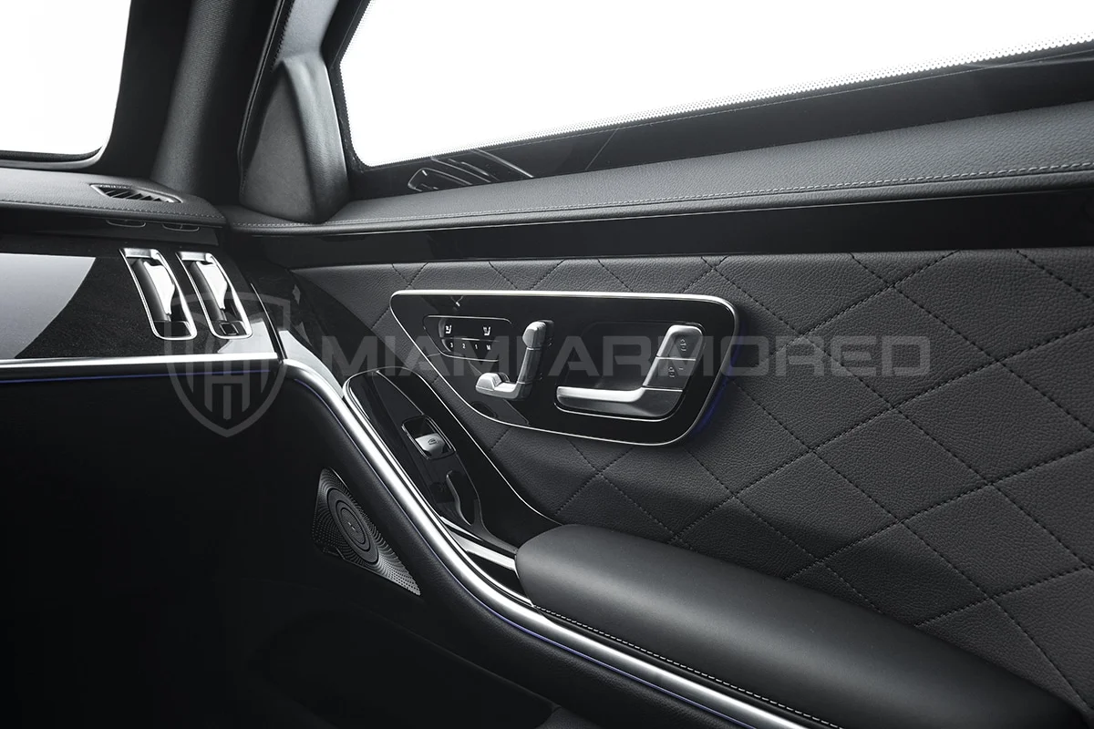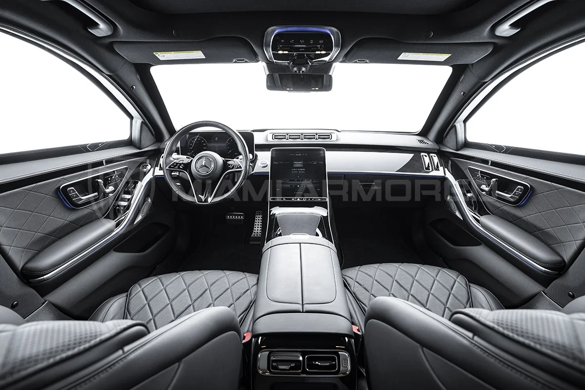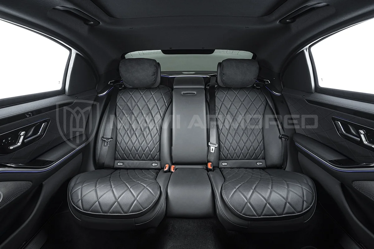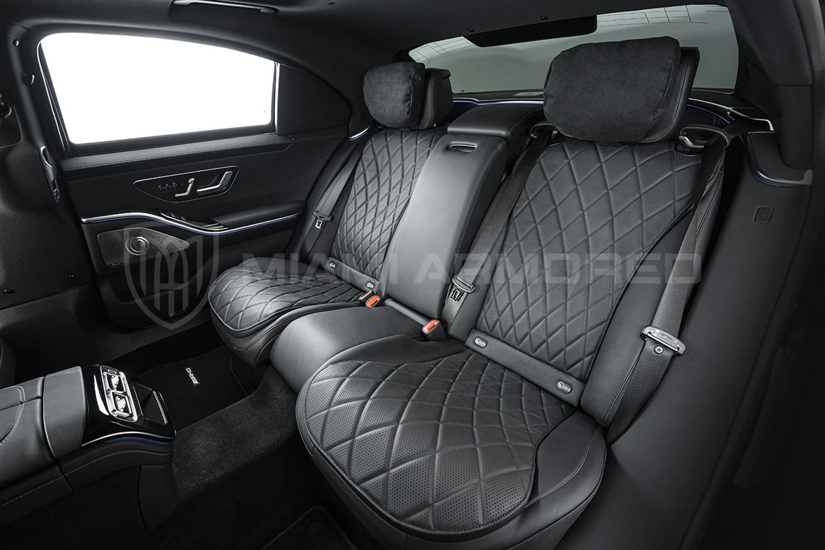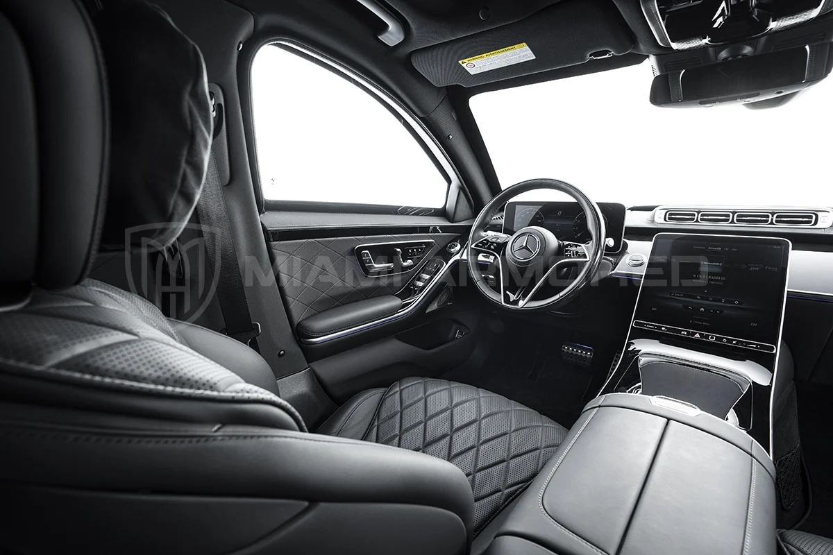 For comprehensive protection, the Miami Armored® S580L is outfitted with top-tier ballistic armor that meets the CEN 1063 BR6 standard, fortifying critical structural points throughout the vehicle. This armor ensures resilience against 7.62x51mm high-power rifle ammunition and can withstand the simultaneous explosion of up to two hand grenades beneath the vehicle. Additional tactical enhancements such as air filtration, night vision, engine bay fire suppression, strobe lights, sirens, and PA systems are available, ensuring this armored luxury car offers unmatched security and safety.